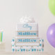 Adorable blue "It's A Boy" design. Blue baby clothing on a line. Press the "Personalise It" tab to add your child's name.