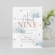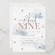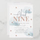 This cute "the bride is on cloud nine/9" bridal shower invitation features fluffy blue clouds and faux gold stars on a white background. The reverse side features a white background with geometric patterns in light blue. Personalise for your needs. You can find more matching products at my store.