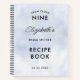 An elegant bridal shower recipe book with a Cloud 9 theme, featuring a pastel blue sky background, modern script calligraphy and simple, clean, modern typography.