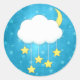 Stars are suspended from a cloud against a textured, starry blue background. A yellow moon peeks out from behind the cloud.