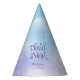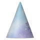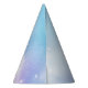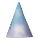 Dreamy 9th birthday party hat featuring watercolor illustration of pink, blue and purple sky with clouds and stars. The text says "cloud nine."