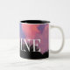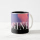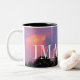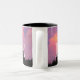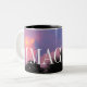 The wraparound design on this inspirational mug is an original photograph of clouds in the eastern sky reflecting the sunset in the west, over the Gulf of Mexico. The tropical evening sky is bathed in a warm pink glow above the dark silhouette of palm trees. The clouds are developing into very interesting shapes, looking almost like fluffy toys or...use your imagination...the soft pink colours of the sheer clouds near the bottom of the photo intensify as the sun hits the thick, billowing shapes of the thicker clouds rising into the sky. The puffy shapes at the top of the clouds have yellow highlights. Centred over the photo around the mug is the word IMAGINE, in tall thin white capital letters. This text is set to be personalised, or deleted as you like.