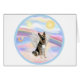 A German Shepherd angel floats in heaven's fluffy pastel clouds. Personalisation is available through the "Custom" button.