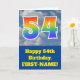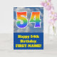 The front of this fun 54th birthday greeting card design features a representation of a blue sky with clouds, along with the number "54" having a multicolored rainbow spectrum like gradient look. The front also features a birthday greeting message, including a customised recipient name. The inside features a custom birthday greeting message, or could perhaps be cleared and left blank if a message is to be written by hand instead. A customisable birthday card like this might be a fun way to send birthday wishes to somebody who is celebrating their fifty fourth birthday. [~Z0000370]