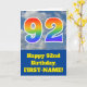 The front of this fun 92nd birthday greeting card design features a cloudy blue sky depiction, along with the number "92" having a multicolored rainbow spectrum like gradient pattern. The front also features a birthday greeting message, including a customisable recipient name. The inside features a personalised birthday greeting message, or could perhaps be cleared and left blank if a message is to be written by hand instead. A customisable birthday card like this might be a fun way to acknowledge somebody’s ninety second birthday. [~Z0000370]