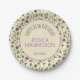 Create a set of personalised paper plates with a name and date for a Happy #th Birthday, featuring red magenta flowers and three-leaf clovers over a pale yellow background for a rustic, country style garden party or baby shower.
