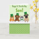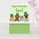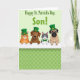 Designed with four cute cartoon animals peeking over a bright white ledge, this St. Patrick’s Day scene feels friendly and a little affectionate, like they’re leaning in to greet someone special. From left to right, there’s an orange tabby cat with green eyes, a brown dog with wide, gentle eyes, a gray-and-white cat with blue eyes and a small green bow tie, and a fawn-colored dog with a wrinkly face and an earnest look. Three of them wear tall emerald top hats with gold buckles, adding a festive touch that pairs nicely with the soft green theme 💚. The background is a pale mint green with a repeating pattern of small three-leaf clovers ☘️, giving the setting a light, airy feel. Near the top, the message “Happy St. Patrick’s Day, Son!” is set in large green letters, centered above the animals. Their faces are turned straight toward the viewer, with tender expressions that suggest warmth and closeness without needing any extra decoration. The white ledge runs horizontally across the lower part of the design, separating the characters from the clover-patterned background.
