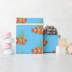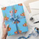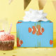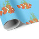 Cute clown fish in seaweed with bubbles and aqua blue background.