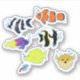 This is a vector design featuring seven sea-dwelling animals including Clownfish, Moorish Idol Fish, Four-striped Damselfish, Yellow Tang, Royal Gramma, Pufferfish, and Shrimp.