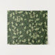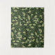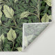 A foliage print with a light almost olive green or sage leaves interwoven into darker greens. A shade of hunter green or a dark forest green creates the large majority of the leaves. These on a background of black.
