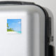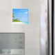 This design features a beach-themed save the date magnet with a white sand and blue water coast line surrounded by palm trees.
