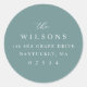 Round return address seal features your name and address in classic white lettering with a script accent, on a soft coastal aqua background. Designed to coordinate with our Coastal Oyster wedding and event collection.