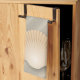 Cute beachy kitchen towel featuring a tan scalloped seashell and beach sand print.