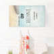 A birthday banner with a beautiful rustic image. Subtle colours of light blue, sandy brown and gentle white. A beach scene with a boat on the shore with a fishing net hanging off the side. An elegant shabby look.