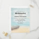 Birthday party invitation postcard with a beautiful rustic image. Subtle colours of light blue, sandy brown and gentle white. A beach scene with a boat on the shore and a faded lighthouse off in the distance with birds flying around. An elegant shabby look.