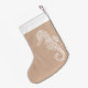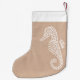 A coastal beach theme Christmas stocking with a white seahorse and light brown burlap or linen style background. Perfect for a beach theme Christmas! Great for a cottage or coastal chic home or room decor.