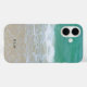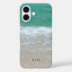 This pretty coastal monogram iPhone 16 case has a pretty photo of a beach with aqua blue waves and tan sand with the monogram or text of your choice.
