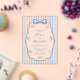 This coastal blue whimsical wedding acrylic invitation features a coquette scalloped frame with a bow on a background of watercolor stripes, hand drawn beach seashell doodles, and handwriting script.