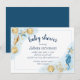 Whimsical dusty blue and gold hand-painted beach and sand watercolor "under the sea" themed shower collection. The design features seashells, starfish, a seahorse, and coral reef in complimenting shades of blue, gold, and off white with a splash of blue for a water effect. The details in navy blue modern lettering are framed by the nautical watercolor garland border of elegant sea coral, shells and starfish.