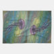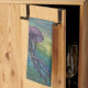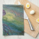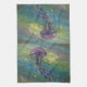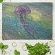Deep blues, purples, greens and gold highlight this fluid jellyfish print on a kitchen towel. Image was a painting by Stephanie K. Full image on one side.