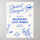 The sign features hand-drawn illustrations in vibrant cobalt blue, capturing the essence of both coastal and cowgirl themes. Delicate seashells, starfish, and ocean waves intertwine with classic western motifs like cowboy boots and a cowboy hat, creating a stunning visual tapestry that celebrates the bride-to-be's adventurous spirit.