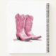 Coastal Cowgirl Spiral Notebook. © Radenbrea Studios at Zazzle. A spiral notebook with a pair of pink cowgirl boots and a cowgirl hat on the cover. The boots and hat are on the beach with starfish, rocks and shells around them. Great for all sorts of projects at home, the office or at school.