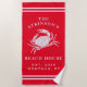 Coastal Crab Beach House Rustic Family Name Red Beach Towel. Personalise this custom design with your own family name, year established, city and state. The perfect summer beach towels for your family lake house, cottage, or beach house.