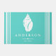 Elegant white conch shell illustration in the centre. The background has a sea glass green colour and personalised family name text in brown. This doormat is elegant, chic, and would make a great impression on your house guests as they are welcomed to your home!