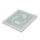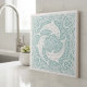 This intricate, vintage-inspired design features three graceful dolphins swimming in a circular, yin-yang-like arrangement. The dolphins, rendered in crisp white, are set against a richly detailed teal blue background filled with elegant swirling scrolls, delicate dots, and organic maritime motifs suggesting waves and bubbles. The whole image is framed by a highly decorative, square border featuring sophisticated floral and baroque elements. Perfect for adding a touch of classic, Mediterranean, or coastal charm to any home decor item. Search ID1208 to see additional colors and design motifs in this series. Note: design may contain generative content