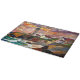 Beautiful cutting board featuring a charming coastal village with a lighthouse overlooking the ocean at sunset. The artistic stained glass style adds warmth and elegance to any kitchen.
