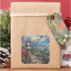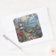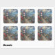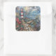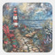 Coastal Lighthouse Square Sticker. © Radenbrea Studios at Zazzle. Sticker with a coastal scene depicting the ocean, a lighthouse, a deck chair and a path with flowers alongside.