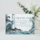 This coastal wedding design features a hand-illustrated lighthouse rising above dramatic ocean waves, framed by flowing watercolor textures in soft teal, seafoam, and deep blue tones. The composition blends nautical romance with an elegant, storybook feel, creating a striking yet refined seaside aesthetic.