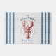 Coastal Lobster Seaside Beach House doormat features a white background with a red watercolor style Maine lobster and navy blue rope stripes. Personalise it with your family name and the date established in a classic navy blue font. Perfect for summer beach homes and waterfront cottages.