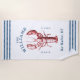 Coastal Lobster Seaside Family Vacation beach towel features a red watercolor Maine lobster with navy blue striped nots at each end. Personalise it with your family name and the date established. Perfect for summer beach homes, waterfront cottages and family vacations.