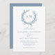 Perfect for beach and nautical themed weddings, a coral wreath frames the monogram initials of the bride and groom at the top of this elegant minimal white and dusty blue coastal invitation. The back is a solid dusty blue colour.