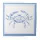 This coastal inspired ceramic tile features a classic coastal crab in blue and white on a background of matching blue.