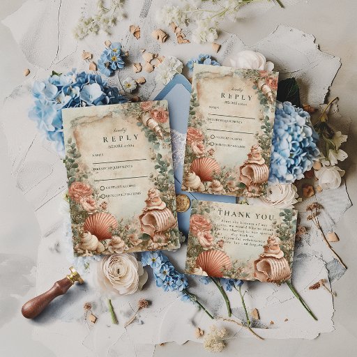 This romantic design draws inspiration from the Mediterranean coast, blending soft seashell details with muted botanicals and a vintage parchment background. Earthy neutrals, blush tones, and coastal textures create an old-world, seaside aesthetic that feels elegant, timeless, and effortlessly refined.