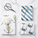 A delightful set of nautical gift wrapping sheets with a coastal theme, this design set includes 3 watercolor styles: one has an anchor with seaweed and a seahorse, one has nautical blue watercolor painted stripes, and one has a pattern of painted blue crabs. This wrapping paper is a perfect choice for gift giving occasions throughout the year, including birthdays, graduations, bridal or baby showers, anniversaries, retirements, anniversaries and more. It also adds a special coastal touch to your holiday packages and gifts.