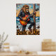 This dynamic artwork portrays a lion, looking effortlessly cool in sunglasses and a leather jacket, masterfully "shredding" an electric guitar while propped against a wooden pole. The scene unfolds on a sandy beach with textured ocean waves and a blue sky overhead. The thick, expressive impasto creates a tangible texture, making the "Rock or Die" declaration resonate with the raw energy of the performance