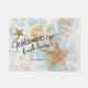 This Welcome Doormat has a beautiful coastal starfish print with one large and small realistic starfish and several others overprinted in white on light blue background and Welcome in a script font. Look for other products in this Coastal Starfish Collection. Text reads: Welcome To Our Beach House. Customising your family name is easy to do. Design by Jenn's Emporium.