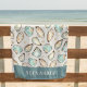 This coastal chic beach towel features soft cream and aqua watercolor oyster and pearl illustrations. Perfect for beach houses, coastal abodes, or anyone who loves oysters and fresh shellfish. Personalise with a family name or monogram along the bottom.