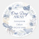 Add a charming finishing touch to your favors with this elegant Coastal Wedding Favor Sticker. This round sticker design features a beautiful watercolor wreath of dusty blue marine life, shells, stingrays, and faux gold coral. Perfect for sealing envelopes, decorating favor bags, or personalizing guest gifts for a beach, seaside, or Nautical Chic event. The sticker includes the phrase "One Day Away" and the couple's names. Ideal for destination weddings and parties, this sticker is an essential detail for consistent packaging.