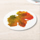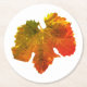 Grape leaf is cemtered. Colours of single leaf are in oranges, yellows, and green.