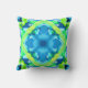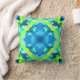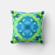 Throw pillow in a tie dye pattern in shades of cobalt blue, turquoise, and lime green, accented with white