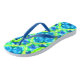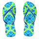 Flip Flops in a tie dye pattern in shades of cobalt blue, turquoise, and lime green, accented with white