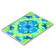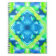 notebook in a tie dye pattern in shades of cobalt blue, turquoise, and lime green, accented with white