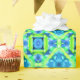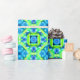 Wrapping paper in a tie dye pattern in shades of cobalt blue, turquoise, and lime green, accented with white