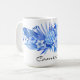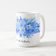 An impressive composition of Cobalt Blue watercolor tropical flowers and leaves, large protea flower in centre, a blue passion and several frangipanis decorate this classic 15oz coffee mug. Large capacity for hot or cold beverages. Easily change name, add text, or remove using the Template provided. See "About This Product" at side for more information and care.