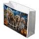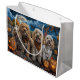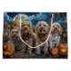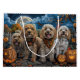 Unleash the spooky spirit with this eerie Halloween design featuring a pack of dogs under a dark, moonlit sky, surrounded by flying bats and glowing pumpkins. Perfect for those who love a touch of frightful fun with their furry friends!