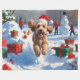 A fluffy Cockapoo runs happily through the snowy winter scene, wearing a festive red Christmas hat. This cheerful design highlights the breed’s curly coat, affectionate nature, and playful personality while capturing the warmth and joy of the holiday season. A delightful winter moment full of festive charm.